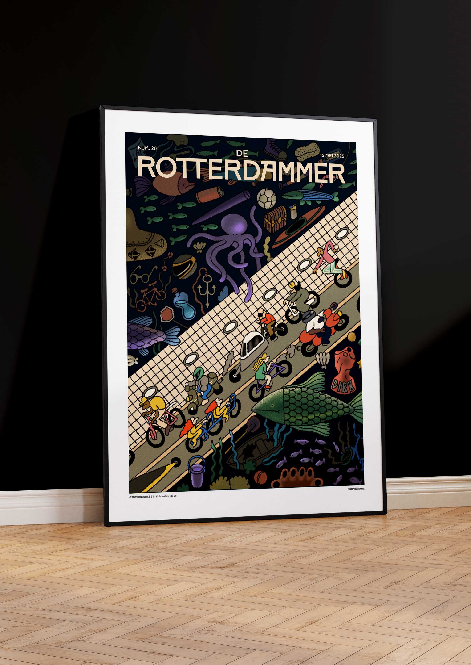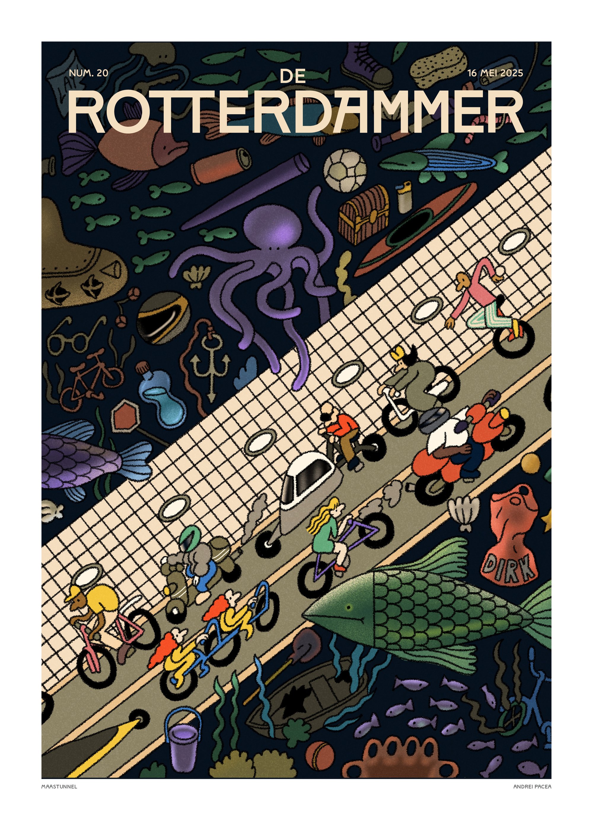 "I live in Nieuwe Westen, and my studio is in the C3 building in Charlois. When I commute, the easiest route is through the Maastunnel. This complex piece of infrastructure has always fascinated me from the access buildings with their quirky shapes and beautiful tilework to the tunnel itself, which feels like an endless, liminal tube. As I bike under the river, I often imagine the world moving above and around me: boat traffic, fish, trash, and forgotten treasures drifting through the water. This drawing is a direct manifestation of those thoughts what my imagination gives me as I speed through the tunnel."
