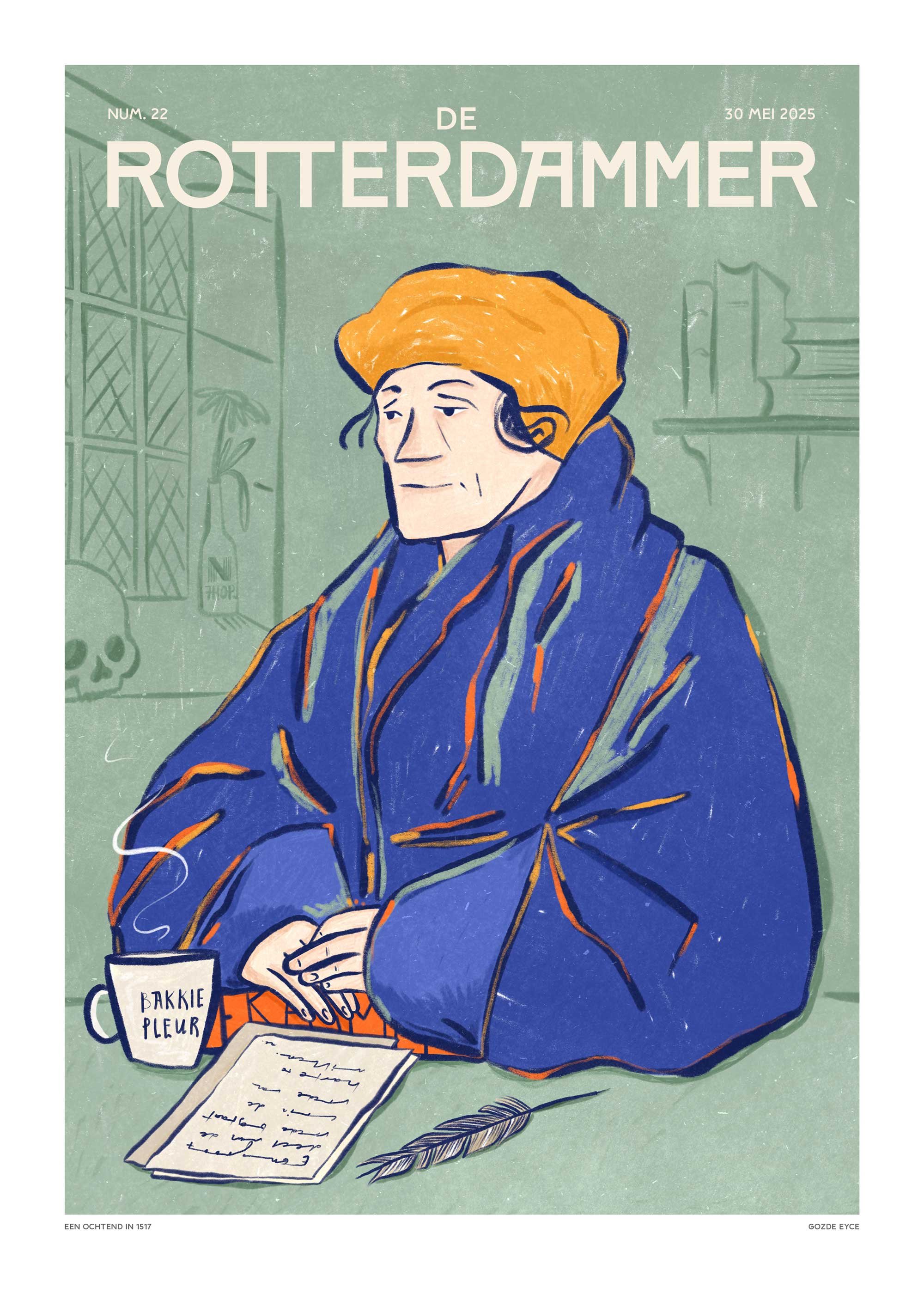 "In Een Ochtend in 1517, Erasmus is reimagined in a quiet, reflective moment, sipping his morning coffee after a long night of writing. Dawn breaks over a Europe on the edge of upheaval, as he contemplates the final lines of The Complaint of Peace — a work in which Peace is given a voice to speak out against the violence and divisions of the world. This illustration blends history with a touch of everyday humanity, inviting viewers to reflect on the power of thought, the value of peace, and the quiet moments that follow great effort and spark lasting ideas."