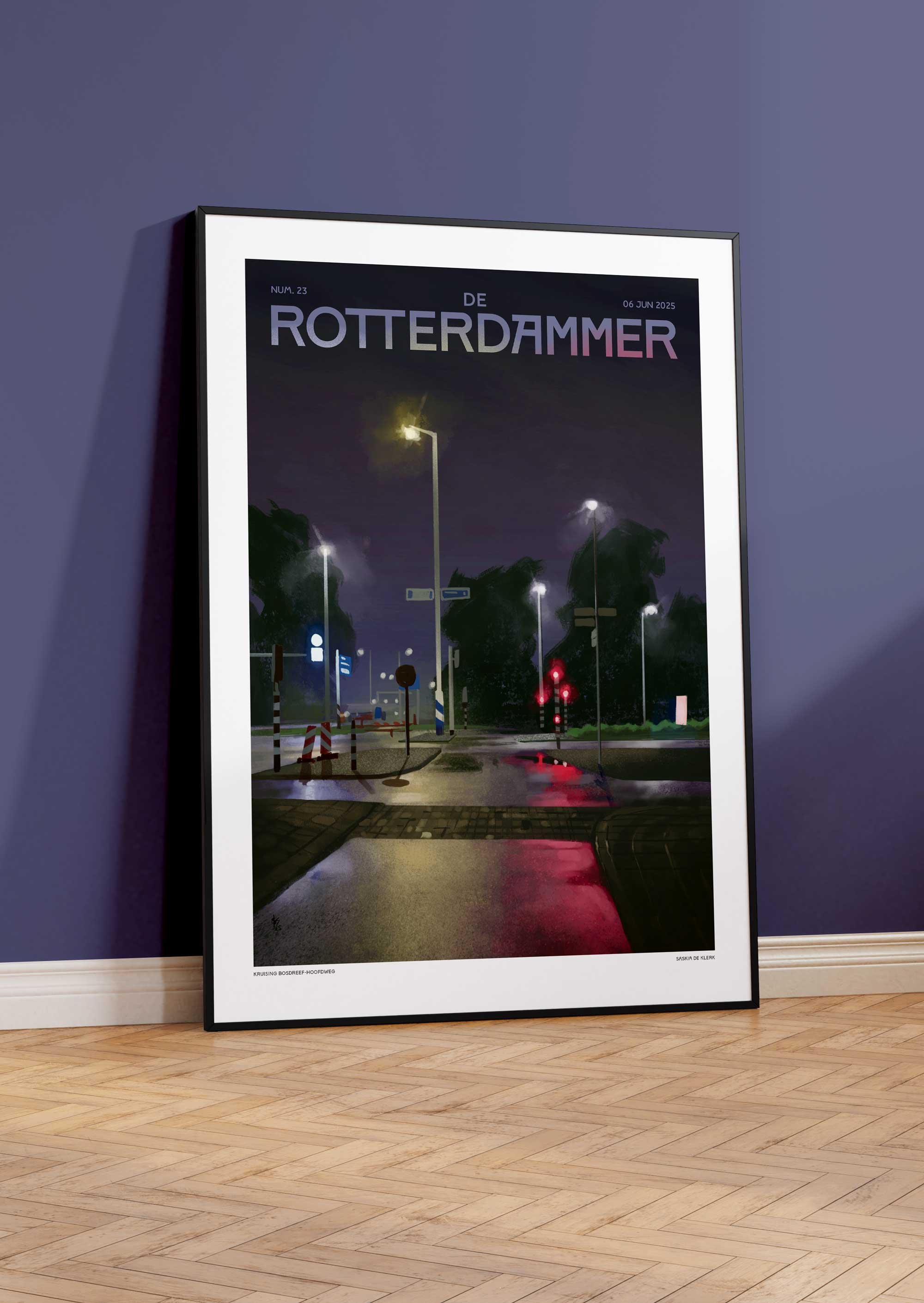 "Living in the far northeast of the city (Zevenkamp), the ride home from the city centre takes about 45 minutes by bike. After visiting friends or shopping, this crossing greets me with its colourful lights, almost as if to say, “you’ve made it halfway!” I’ve just passed through the Kralingse Bos, heading toward Alexander, and from there home is just around the corner. The reflections on the wet asphalt make the scene even more inviting."