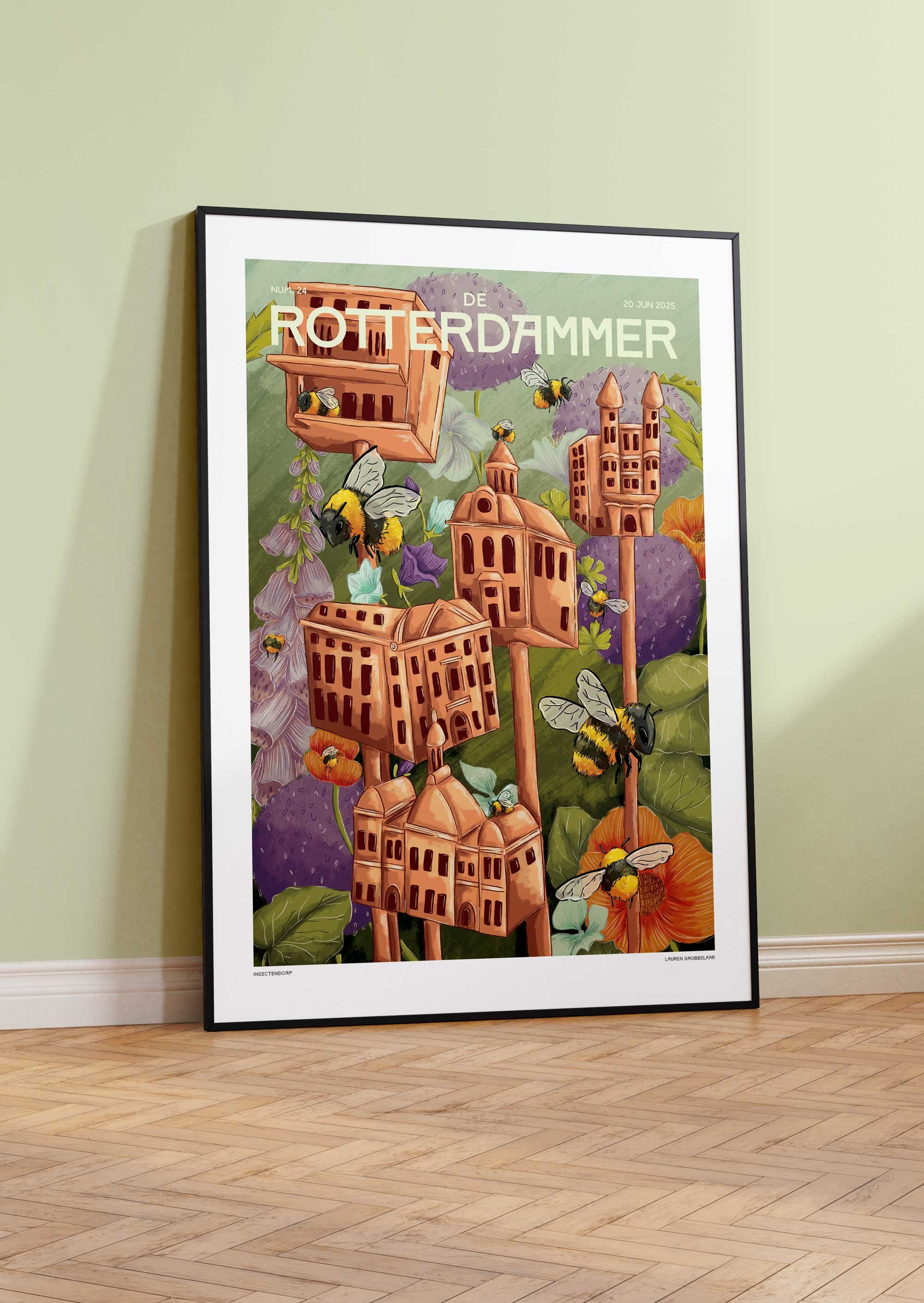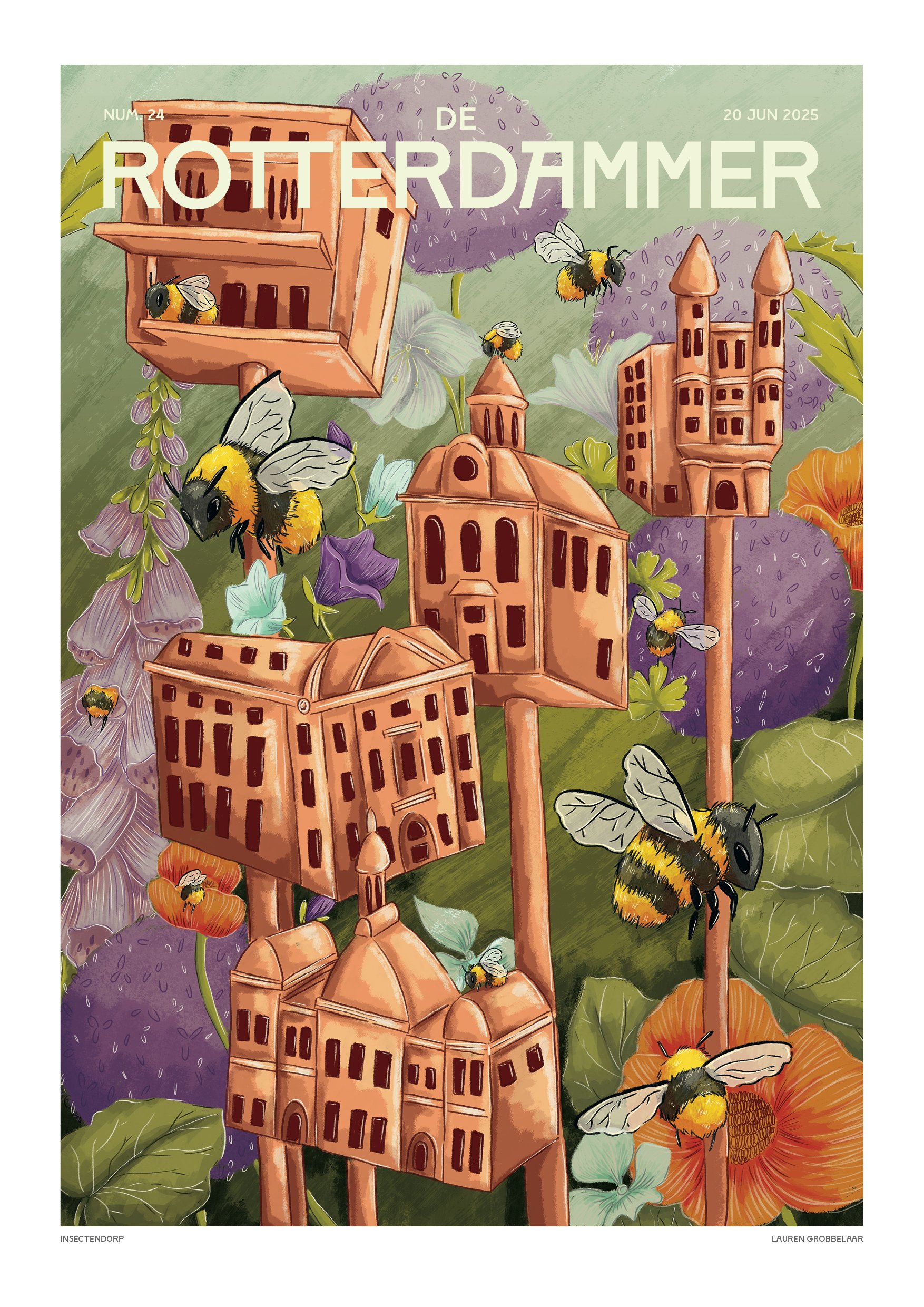 "Insectendorp is inspired by the bumblebee homes found in the Trompenburg Botanical Gardens. The miniature clay houses are based on actual old Rotterdam buildings. I chose to illustrate them because they perfectly represent one of my favourite aspects of Rotterdam: the city’s respect for nature. Coming from a country known for its natural beauty, it has always struck me how South African cities often lack green spaces. It feels very special to live in a city that makes space for nature and animals."